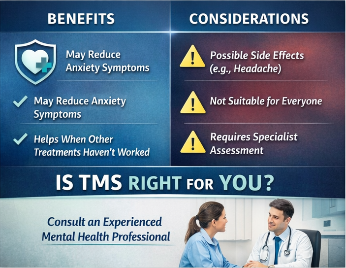 If you are considering TMS for anxiety, the most important step is a professional assessment with an experienced mental health clinician who can determine whether TMS is appropriate for your specific situation and discuss realistic expectations.