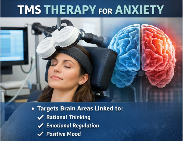 TMS works by delivering targeted magnetic pulses to specific areas of the brain involved in mood regulation, emotional processing, and cognitive control. Many anxiety disorders are associated with imbalanced activity in brain networks, particularly those involved in threat perception, worry, and emotional regulation.